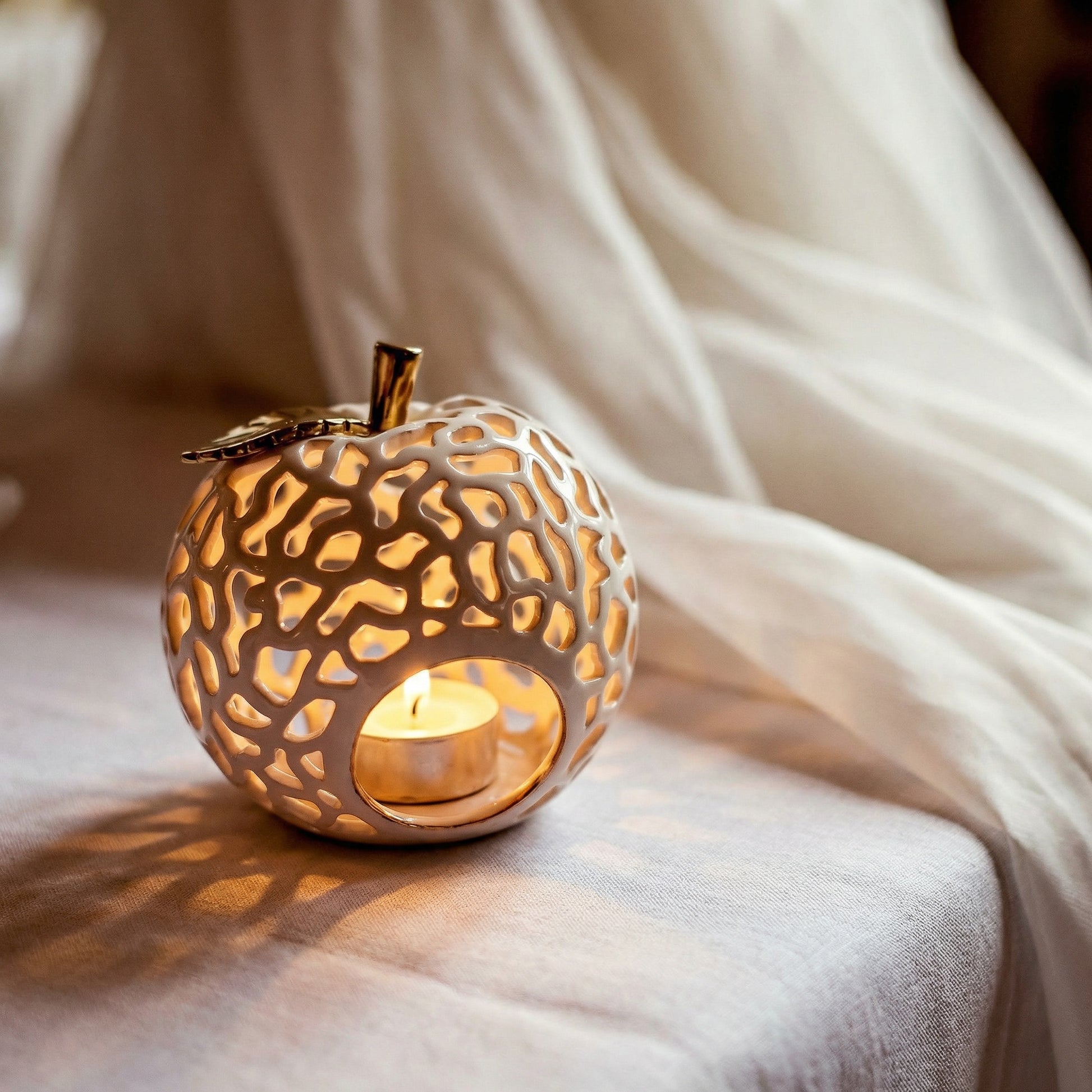Rankų darbo keraminė žvakidė, kurią Darius išraižo rankomis – kiekviena skirtinga, kiekviena vienetinė. Obuolio forma, ažūrinis raštas ir tikro aukso lapelis viršūnėje.